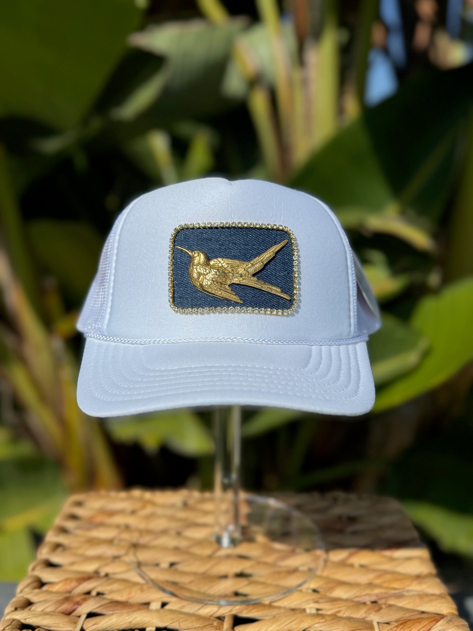 One-of-a-kind denim patch trucker hat with brass sparrow stamping and rhinestone trim.